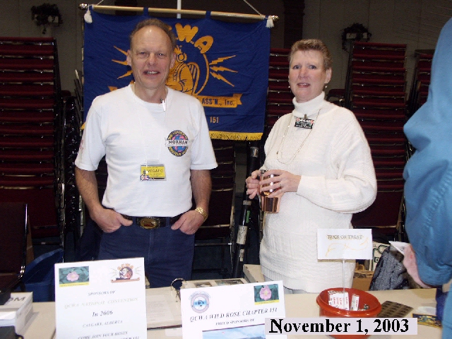Greetings from Chapter 151, Calgary AB, Canada. Our Chapter operated a QCWA table at the Calgary Amateur Radio Flea Market on Nov 1, 2003. Chapter president Ken Oelke VE6AFO and his good wife Linda-Lou VE6LGO spent their day explaining and signing up new members to Chapter 151 QCWA. There were about 260 hams at the flea market and it was a good opportunity to "spread the word" about the QCWA.