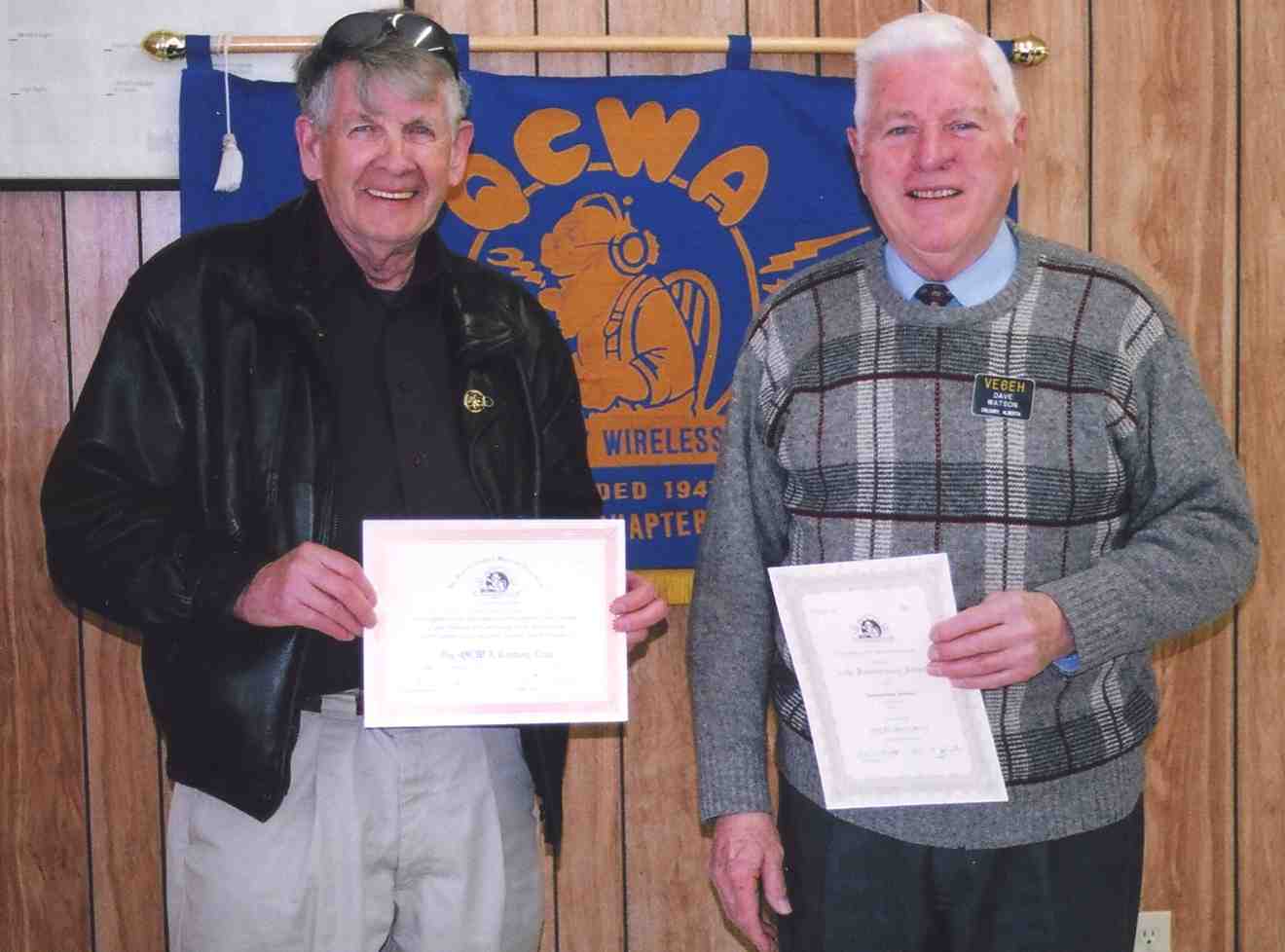 Earle Smith (VE6NM) QCWA Century Club Award and Dave Watson (VE6EH) 55 Year Licensed Award.