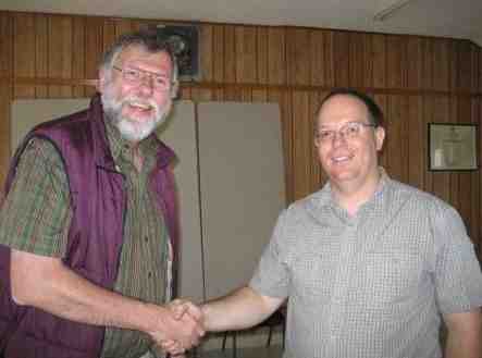 Secretary, Mitch Goodjohn, VE6SM (l) thanks Jason Nishiyama (r) for a his SETI presentation