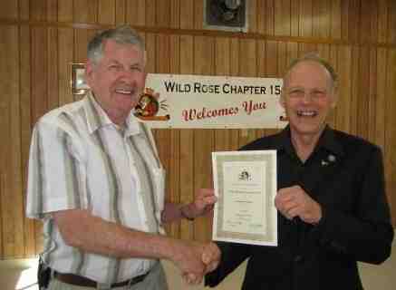 Earle Smith, VE6NM (l) receives his QCWA 60 Year certificate from Chapter President, Ken Oelke, VE6AFO (r)